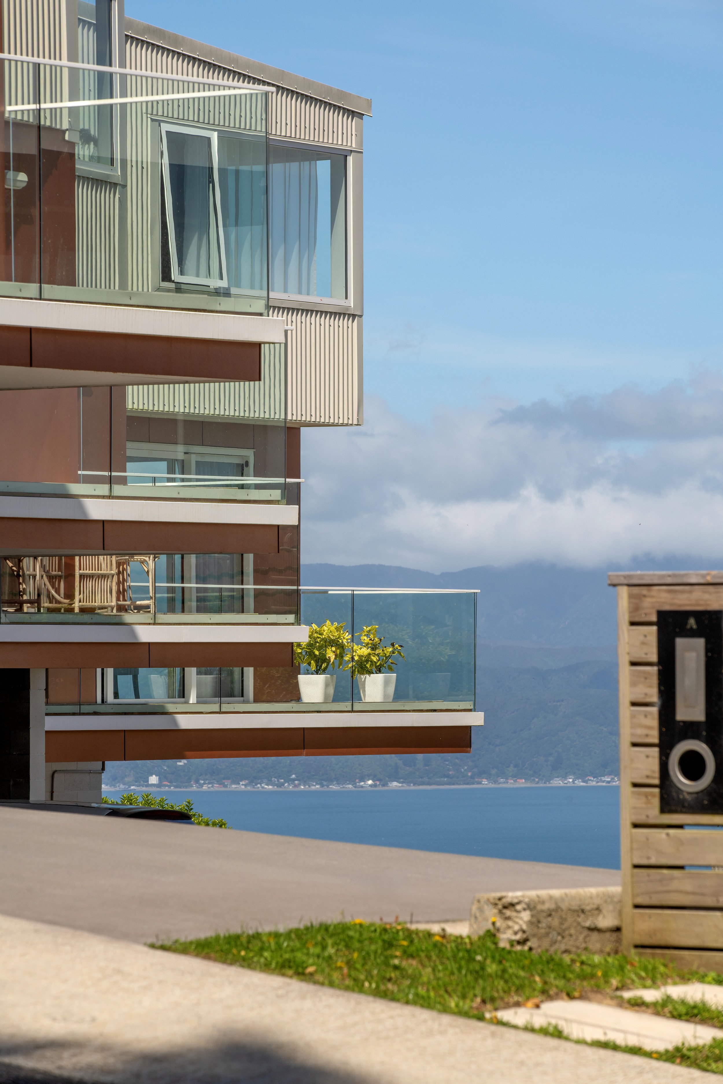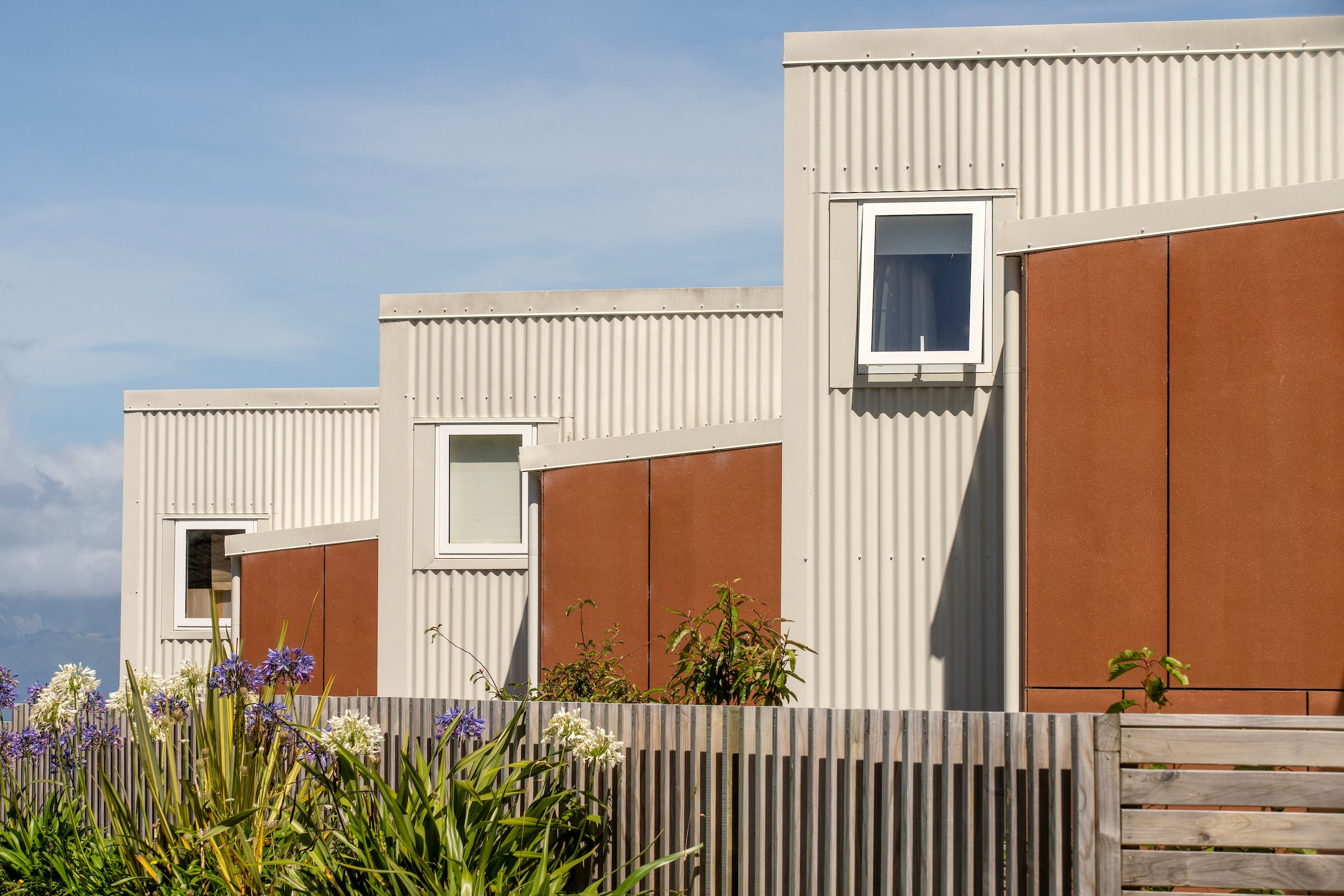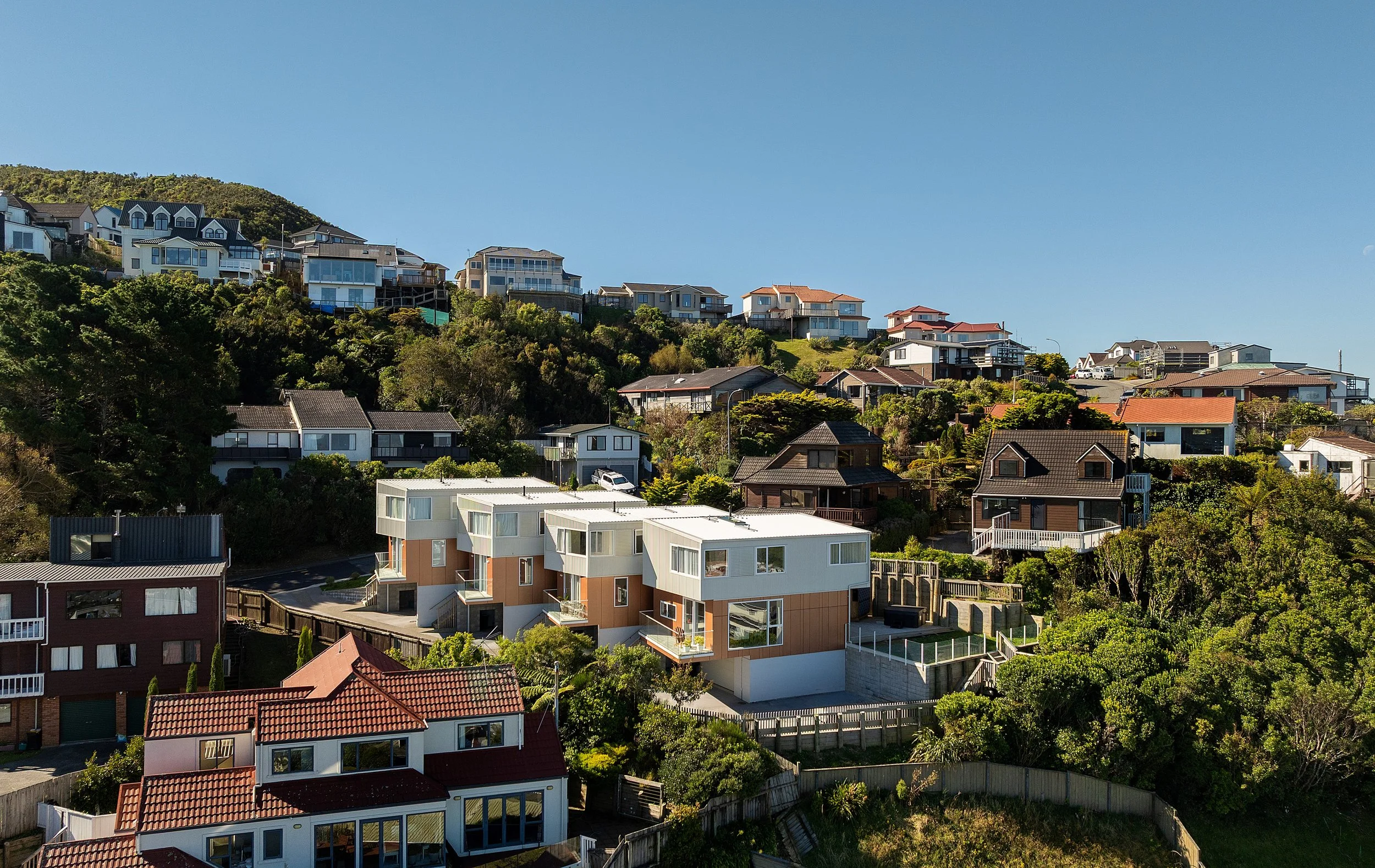 Four townhouses playfully cascade down a steep site in Broadmeadows. The houses are diagonally staggered to maximise the views to the south and sun to the north.